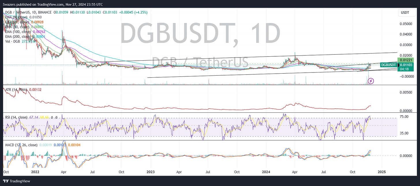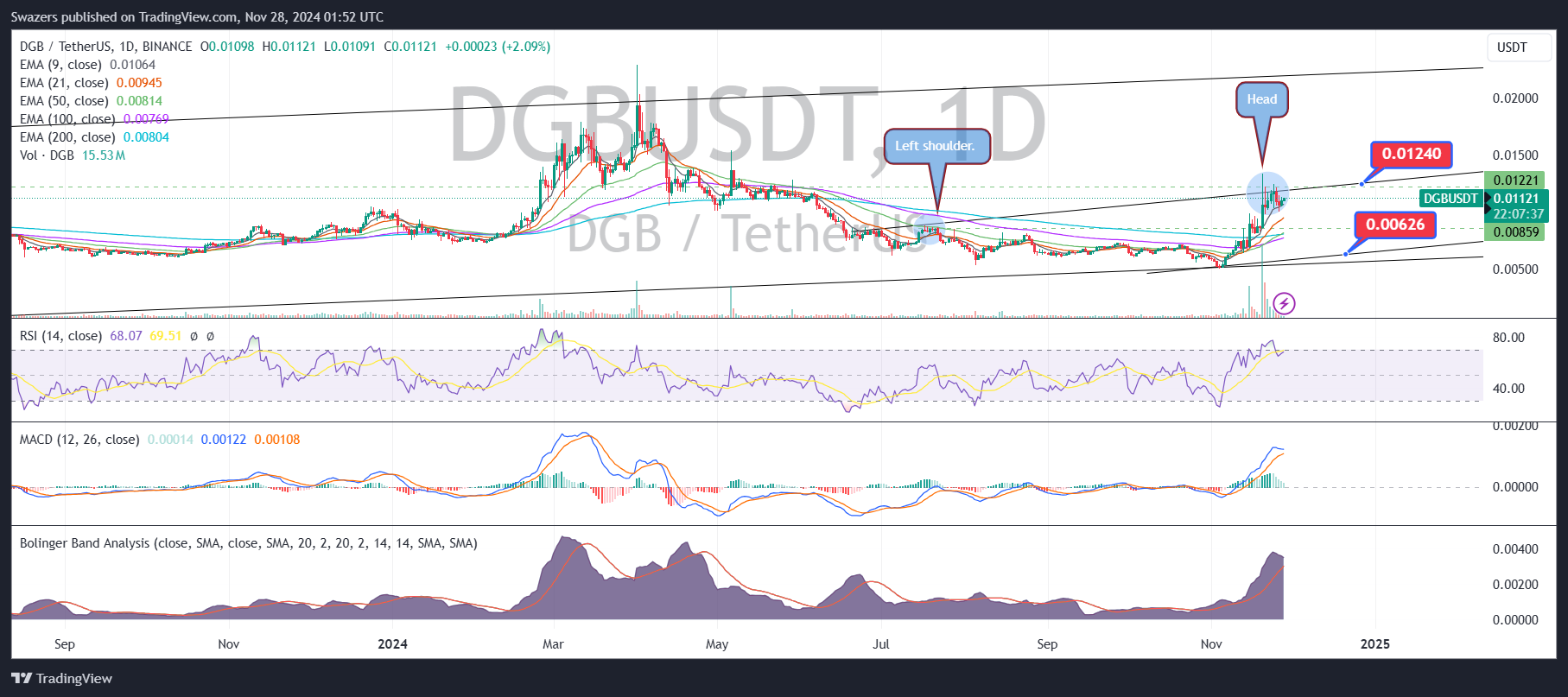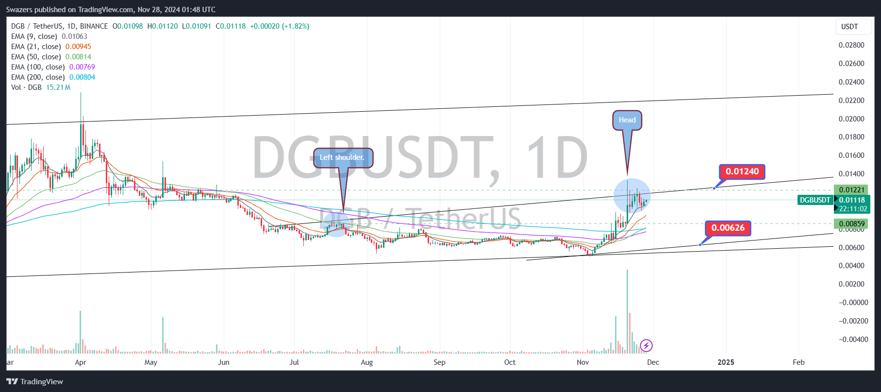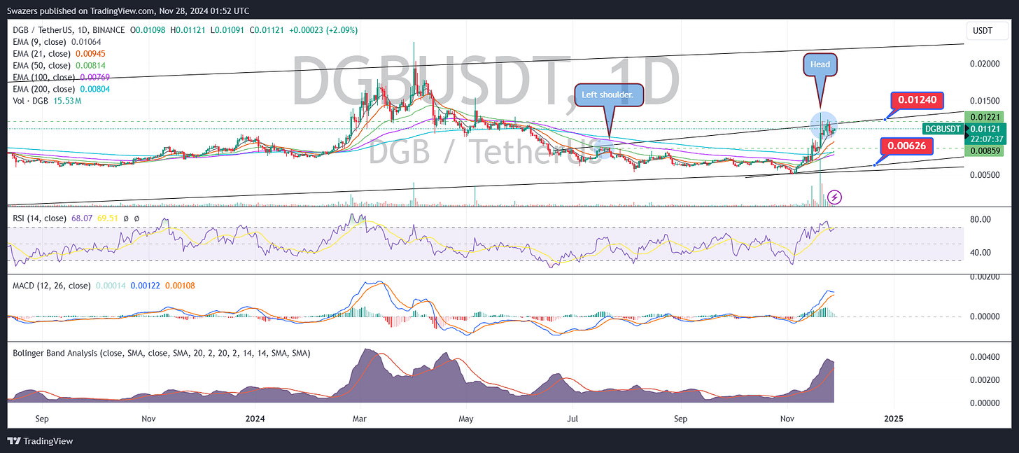 Current Trend: DGB is consolidating after a recent upward momentum, forming a potential ascending triangle pattern.
