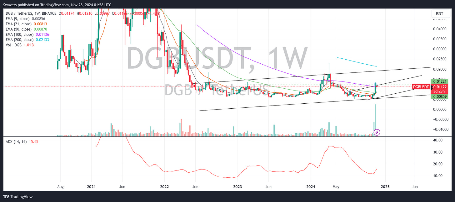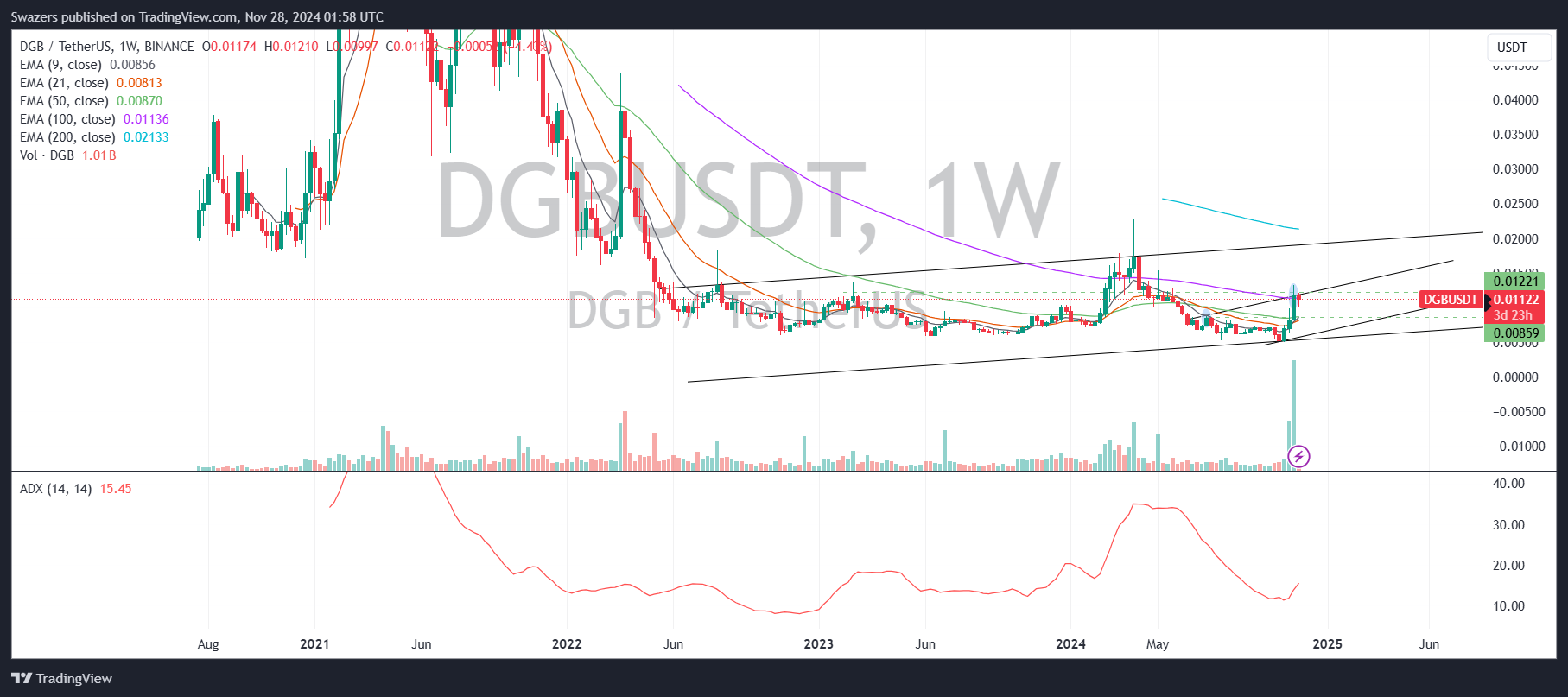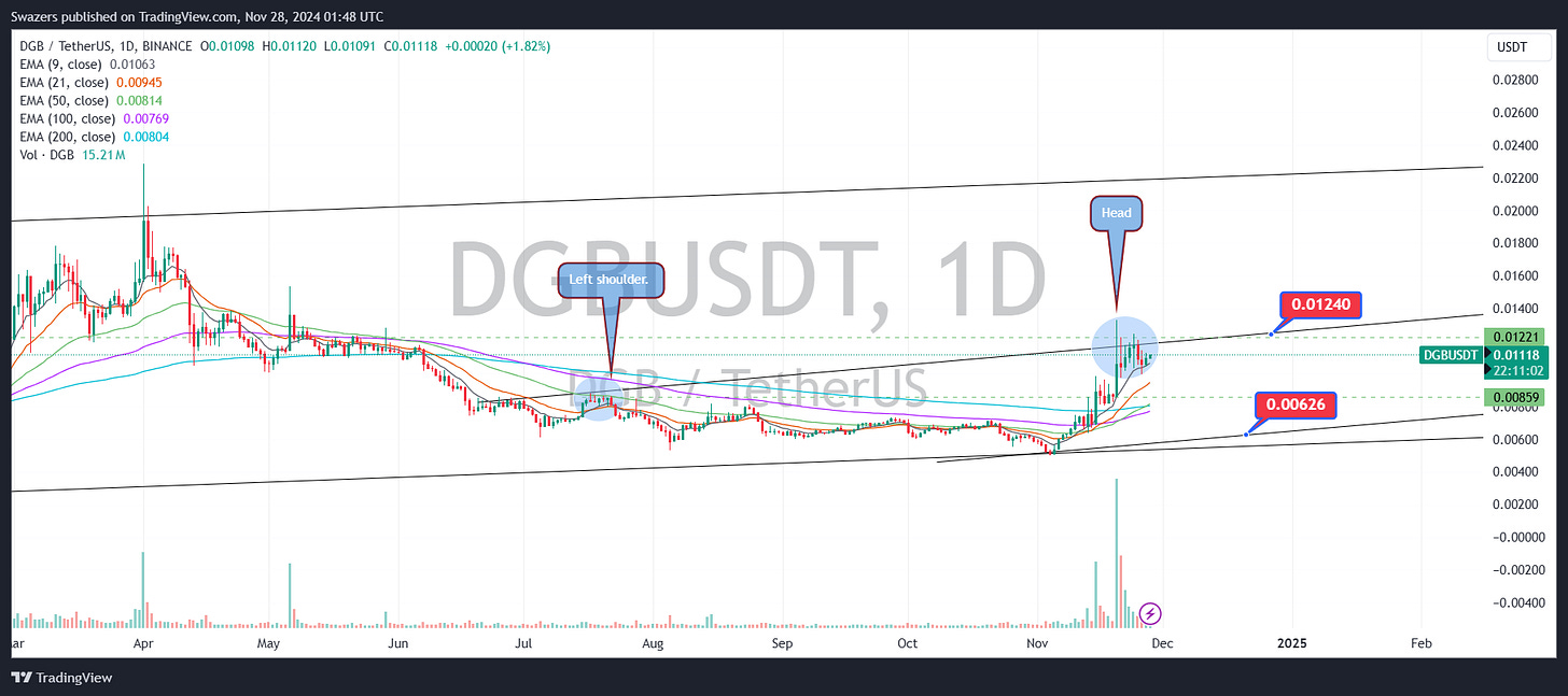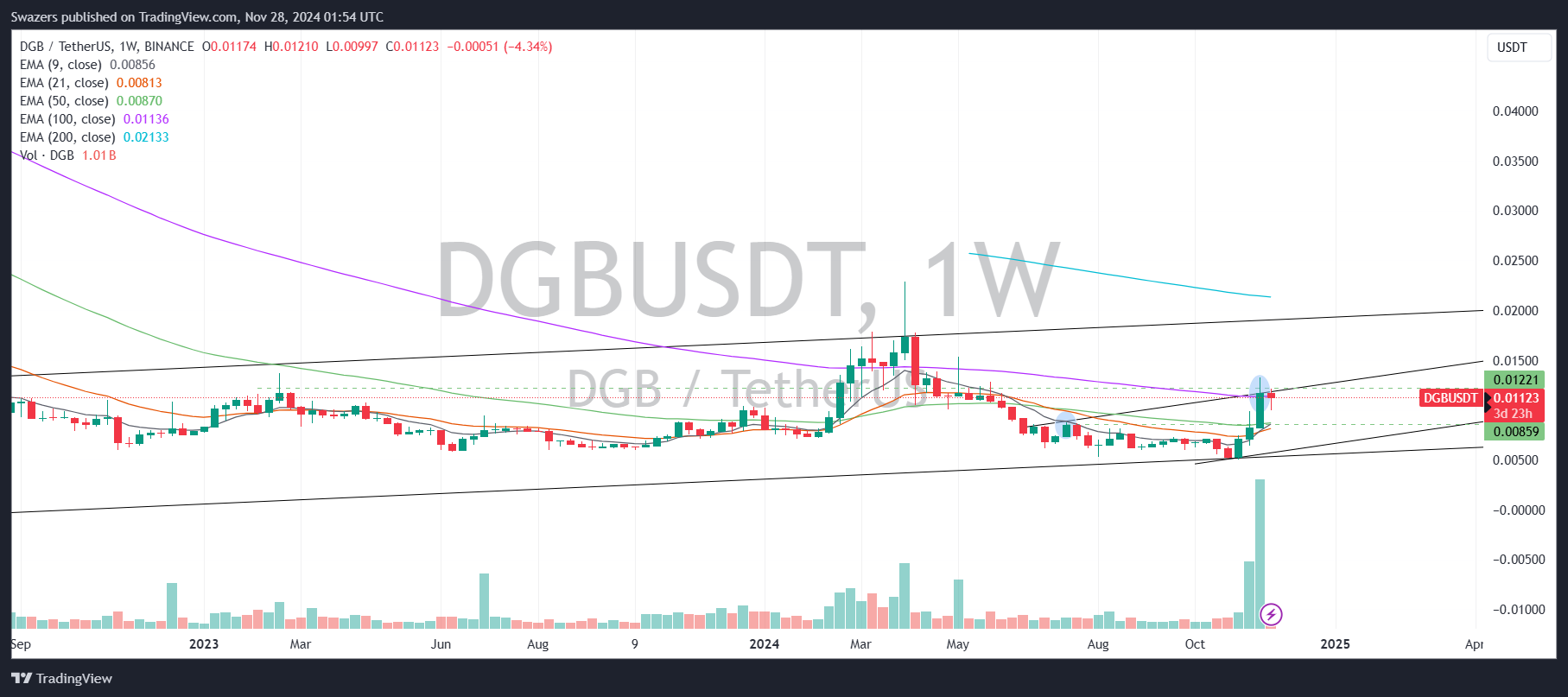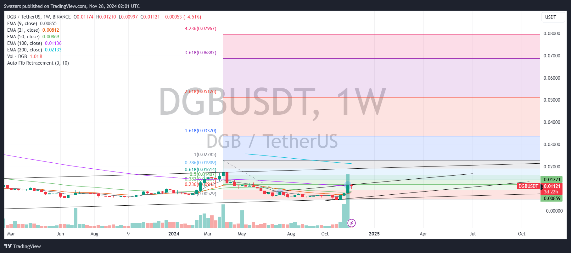 Current Trend: DGB is consolidating after a recent upward momentum, forming a potential ascending triangle pattern.
