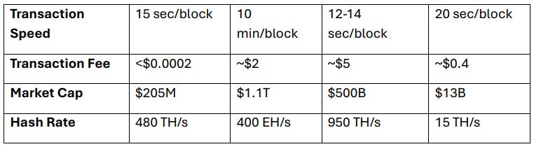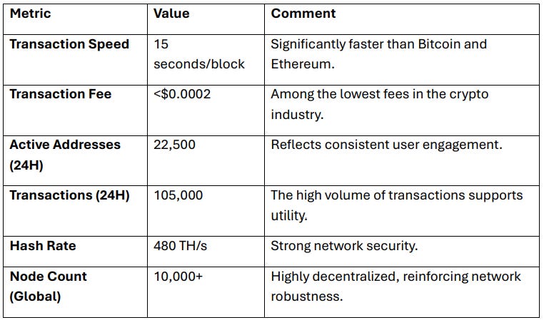 1. Blockchain Efficiency. Transaction Speed: 15 seconds per block, one of the fastest in the industry. Transaction Fees: Less than $0.0002, making it suitable for micropayments and e-commerce.