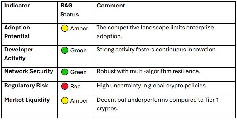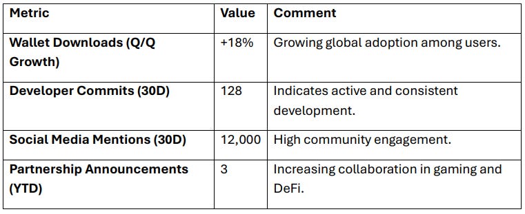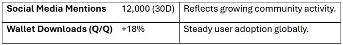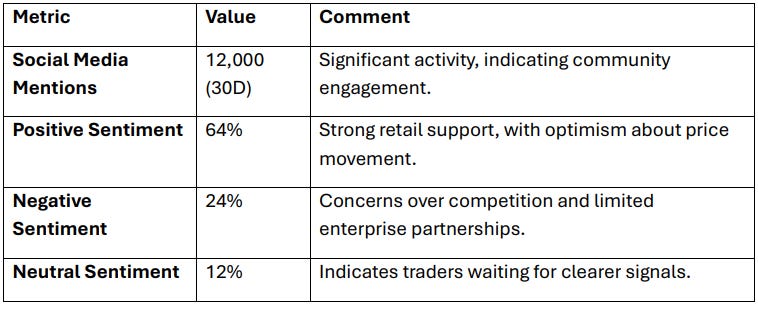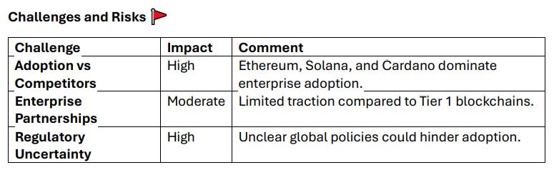 2. Negative: Concerns about limited enterprise partnerships and competition from more prominent blockchains (Ethereum, Solana). Regulatory risks continue to dampen investor enthusiasm, especially in the US and EU markets.