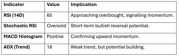 MACD: Bullish crossover, confirming upward momentum. Bollinger Bands: Bands are widening, signalling incoming volatility.
